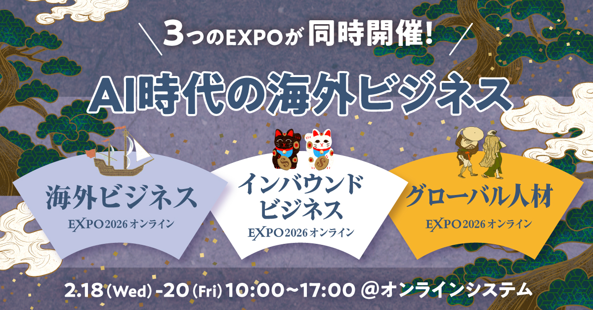 202年2月18日(水)~20(金)に開催される、日本最大級の海外ビジネスイベント「海外ビジネスEXPO 2026オンライン」に出展いたします。